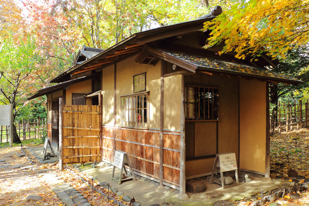 札幌・中島公園に佇むこの二畳台目の茶室は、連子窓が2つ、下地窓が4つ、衝上窓(天窓)が1つ、合わせて8つの窓を持つことから、この名で呼ばれています。先に紹介した孤篷庵忘筌とは異なり、窓の配置や内部の意匠、用いられた材料などに、わびの風情が豊かに感じられます。