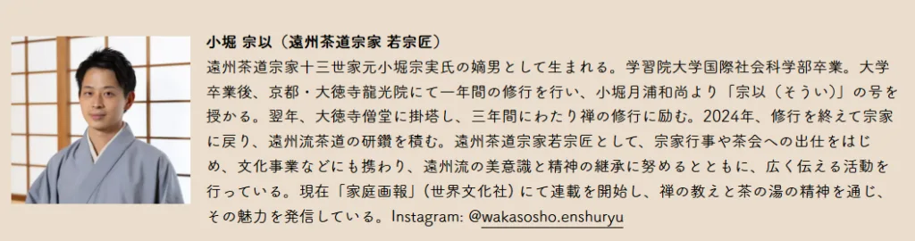 遠州流茶道では、茶の湯の精神と美意識を礎としながら、伝統文化の継承とともに、現代社会における文化の発展と対話を重視した活動に努めております。本件もまた、文化の未来を見据えた貴重な機会となるものと存じます。
