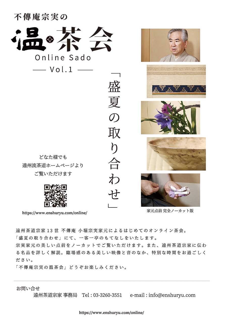 今回は「盛夏の取り合わせ」にて、一客一亭のもてなしをいたします。宗実家元の美しい点前をノーカットでご披露。また、遠州茶道宗家に伝わる名品を詳 しく解説しております。